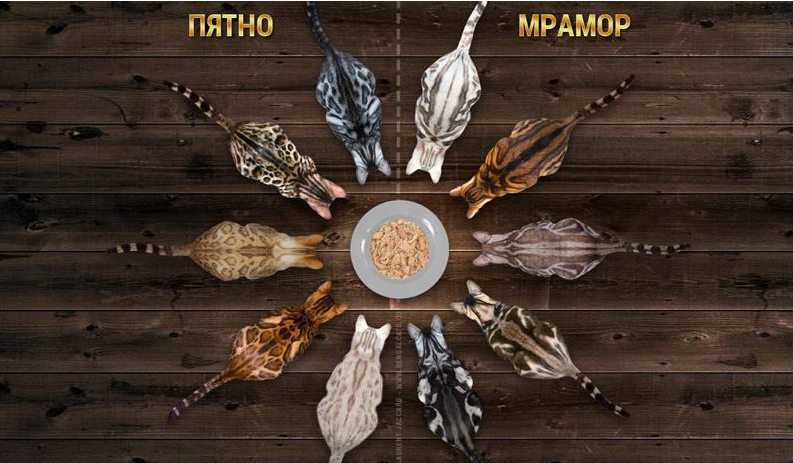 Чтобы наглядно увидеть разнообразие оттенков и пятен бенгальской породы проще использовать таблицу стандартов или посмотреть их на фото.