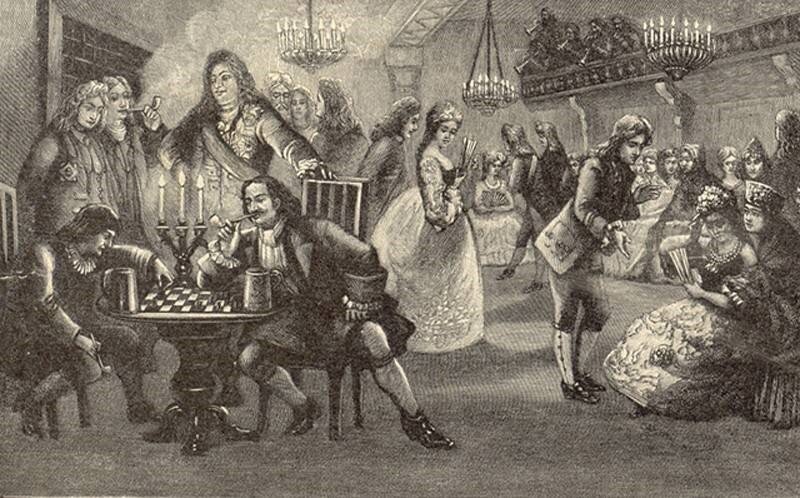 В 1718 году Пётр I издал указ об ассамблеях, так он решил европеизировать быт и внешний облик общества. Зимой три раза в неделю в домах обеспеченных горожан по очереди проводились собрания - ассамблеи, и в них в обязательном порядке должны были участвовать не только мужчины, но и женщины. На ассамблеях должно было делиться новостями, обсуждать деловые вопросы, вести светские беседы, а после - веселиться, пить и танцевать. В Москве комендант, а в Санкт-Петербурге - обер-полицмейстер назначали, в чьём доме будет проводиться следующая ассамблея, длилось такое собрание "не только для забавы, но и для дела" с 17 до 22 часов. Обычно готовилась курительная комната, комната для танцев, комната для игр в шахматы и шашки. Карты Пётр не признавал. Танцы - вот что было главным увеселением ассамблей. Танцы были церемониальные (польский полонез и минуэт) и английские (англез, аллеманд, контрданс). Надо сказать, что подданные мало того, что были непривычны к танцам, так ещё плохо двигались в неп