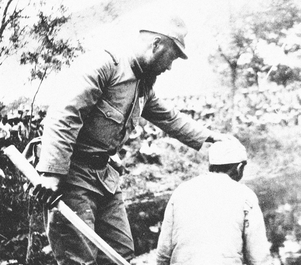 Японский солдат рассказывает китайскому мужчине как правильно нужно встать, чтобы он красиво отрубил ему голову, 1938 год Считалось особым шиком отрубить голову таким образом, чтобы она повисла на коже шеи, и тело, под весом головы, аккуратно упало в предварительно вырытую убитым могилу. Закапывать могилу обычно заставляли следующую жертву.