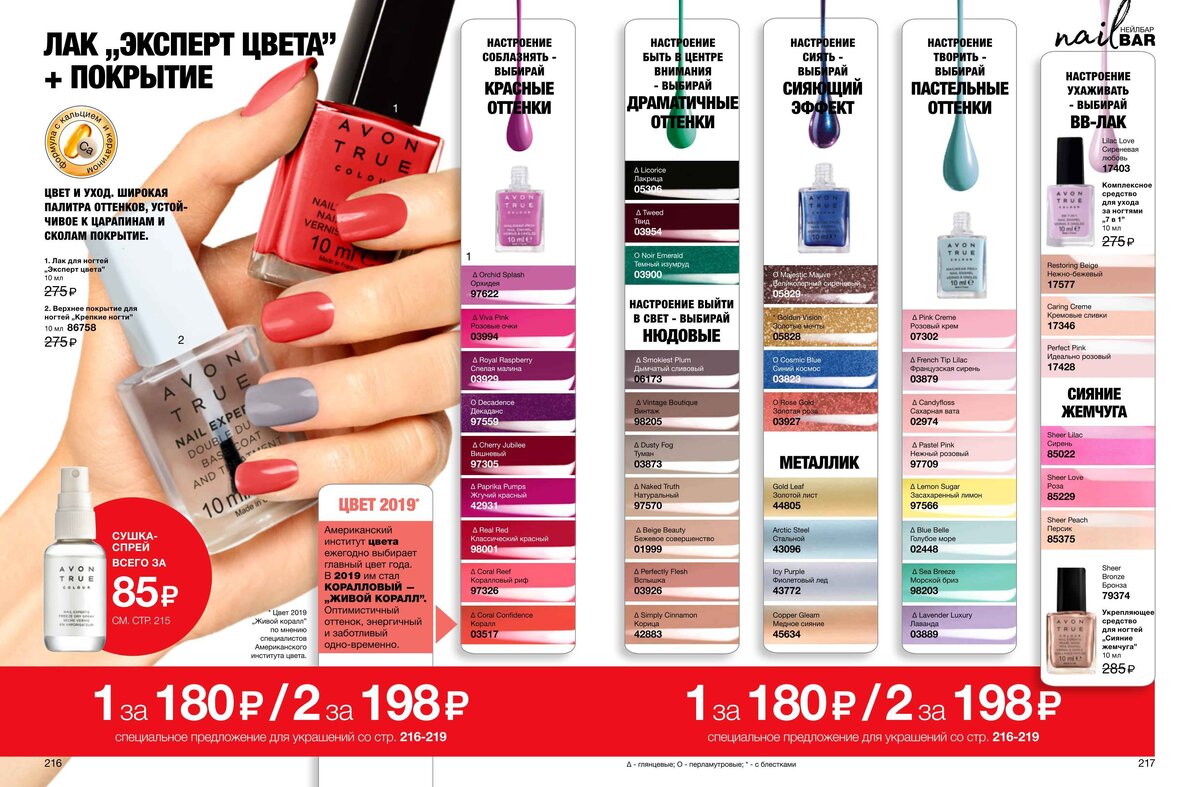 Всем привет! Сегодня поговорим о лаке для ногтей avon. В действующем каталоге 97 оттенков лака для ногтей. Стоимость всех лаков одинаковая 180 рублей при покупке 1 лака или 198 за 2. Каталог 5 действует с 26.03 по 15.04 2019