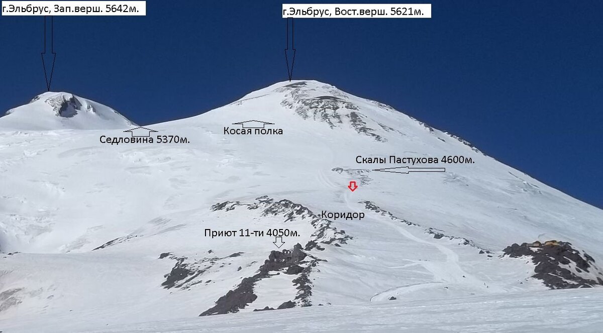 Немного передохнув и выпив чаю, взяв в одну руку ледоруб, в другую трекинговую палку, мы продолжили подниматься. На нашем пути встречались, то непроходимые участки голого льда, то другие группы туристов, которых приходилось, либо ждать пока пройдут, либо обходить их самим. Но больше всего я боялся того, что снова почувствую себя плохо на предыдущей отметке высоты. Однако, мы преодолели ту отметку без труда и дошли до засыпанного снегом ратрака на высоте 5100 м. Оттуда, огибая восточную вершину, вела на седловину узкая тропа на одного человека, называемая «косая полка».