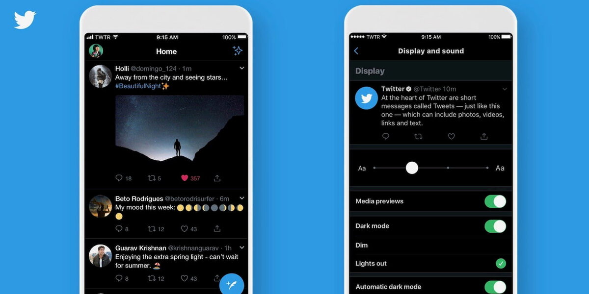 Хотя в приложениях Twitter для мобильных устройств еще с 2016 года есть ночной режим, в нем отсутствовало кое-что важное: черная цветовая схема. До сегодняшнего дня темный режим включал темно-синее оформление пользовательского интерфейса, который был призван уменьшить нагрузку на глаза пользователей. Но теперь, благодаря новой опции, появилась возможность получить настоящий черный цвет. Для этого необходимо включить новый темный режим под названием «Lights Out». Также можно настроить автоматическое включение этой функции в определенные часы. В этом случае приложение Twitter для iOS активирует темный режим, как только узнает, что наступила ночь. Пользователи Android получили такую возможность еще в 2017 году. Если вам все еще нравится темный режим в синих тонах, который теперь называется «Dim», не стоит беспокоиться, потому что он также был сохранен. В режиме «Lights Out» фон будет полностью черным. Это означает, что если экран вашего телефона выполнен по технологии OLED,