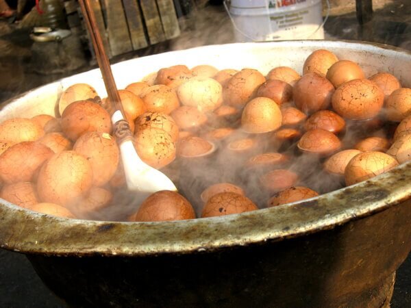 Чайные или мраморные яйца - это в основном яйца вкрутую, приправленные ароматами китайского чая и специями. Есть множество разных рецептов этого блюда, но неизменны два ингредиента: соевый соус и чай. Нам потребуется: 12 яиц 4 - 5 стаканов воды, чтобы полностью погрузить яйца 2 столовые ложки китайского, черного чая 2 больших звездочки аниса 6 гвоздик 12 шт. черного перца 1/2 чайной ложки соли 2 столовые ложки темного соевого соуса 2 столовые ложки легкого соевого соуса Яйца положите в кастрюлю и залейте водой, так чтобы она их покрывала, добавьте все пряности, чай и соевый соус, доведите до кипения на среднем огне. Как только вода закипит, выключите огонь и оставьте яйца в воде, пока она не остынет. Вынимайте яйца по одному и осторожно «ломайте» скорлупу, но только так, чтобы она не отделилась от яйца. Это создаст мраморный эффект на готовых яйцах. Положите их обратно в кастрюлю и поместите ее в холодильник на ночь. Это позволяет яйцам по-настоящему впитывать аромат специй, чая и