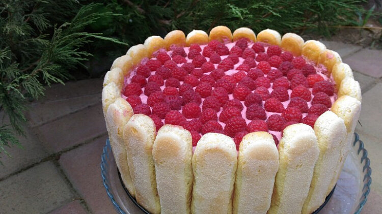 Очень вкусно! О рецепте Сложность: Средне Количество порций: 6 Время приготовления: сутки 1 час 30 мин Ингредиенты - Бисквит Яйца - 5 шт. Сахар - 170 г Ванилин - 0.5 ч. л. Мука - 120 г Крахмал - 3 ст. л. - Сироп Вода - 100 мл Сахар - 70 г - Мусс Свежей (или замороженной) малины - 700 г Яйцо - 2 шт. Сахар - 70 г Крахмал - 4 ст. л. Молоко - 350 мл Сливок 33% (хорошо охлажденных) - 500 мл Желатин - 45 ч. л. Вода - 50 мл Способ приготовления 1. Разделить бели и желтки. Добавить в каждую миску по половине сахара 2. Перелить заварной крем в другую миску. Поверхность крема закрыть пленкой. Хорошо остудить и потом охладить в холодильнике. 3. Собираем торт:Палочки савоярди и коржи пропитать сахарным сиропом. 4. Частями ввести сливки и перемешать сверху вниз. Мусса получается очень много 5. Смешать малиновое пюре с заварным кремом миксером 6. Сливки взбить на высоких оборотах до устойчивых пиков. Чтобы хорошо взбить я сливки и чащу охлаждаю. 7. Ввести желатин в малиновое пюре. Я использую сито,