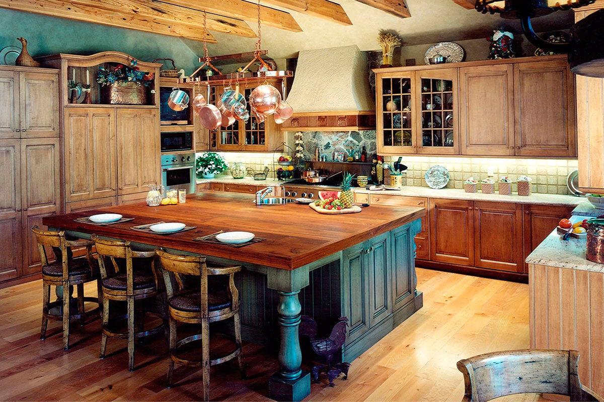 Кухня в стиле кантри всегда ассоциируется с интерьером, где есть большой столовый гарнитур с массивными стульями, резные спинки которых прикрыты чехлами ручной работы. Тепло исходит от изразцовой печи, цветастые занавески и шторы в светлых тонах создают неповторимую атмосферу, наполненную запахом ароматных трав. Стиль кантри дает возможность создать именно такую обстановку — главное, не упускать из виду наиболее важные детали. Основной декор Стилю кантри присуще подчинение деталей общей идее интерьера, поэтому желательно повесить двойные шторы: первые, достаточно длинные, могут быть в мелкий цветочек или в клетку. Но особый шик придают окну короткие раздвижные занавески в нижней части, белые, ажурные, или вышитые. Альтернативой занавескам выступают декоративные деревянные жалюзи, окрашенные в пастельный цвет, соответствующий гамме керамической плитки на стенах или жидких обоев, имитирующих неровную оштукатуренную поверхность. Так как окрашенный дощатый пол в большинстве ж