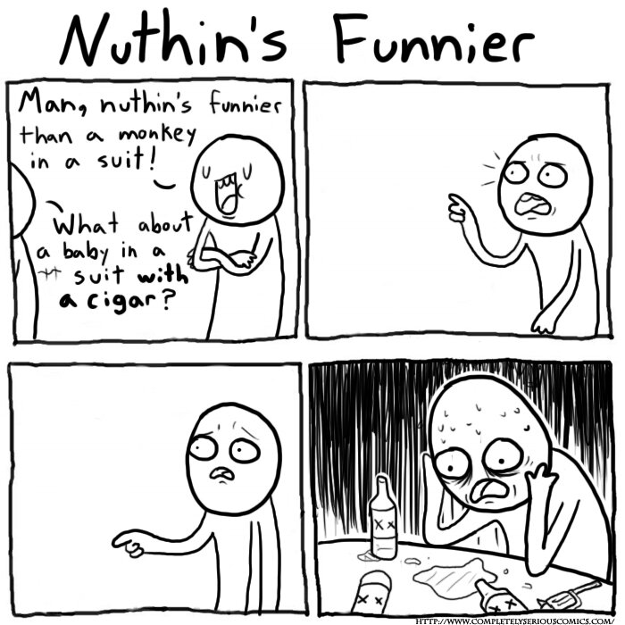 Впервые эта картинка появилась на сайте веб-комиксов Completely Serious Comics, автора зовут Jesse Nylund. В оригинале комикс назывался Nuthin’s Funnier (Нет ничего смешнее). На первом кадре главный герой говорит, что нет ничего смешнее, чем обезьяна в костюме. На что собеседник ему отвечает: «А как насчет ребенка в костюме с сигарой?». После чего главный герой сильно меняется в лице, а на последней картинке сидит в депрессивном состоянии. В итоге комикс быстро обрел популярность и стал известным интернет-мемом.