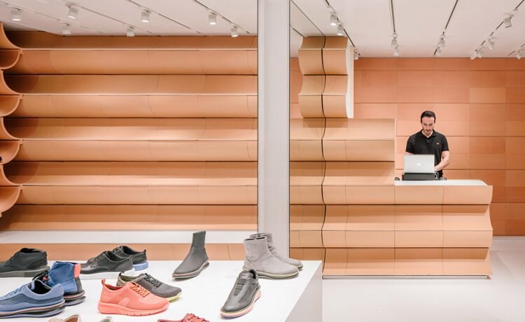 Специально разработанные Кенго Кума вогнутые терракотовые плитки на стенах этого магазина образуют узор в виде рыбьей чешуи. Это второй магазин фирмы Camper, практически полностью отделанный керамикой по проектам Kengo Kuma & Associates. Еще в 2015 году студия японского архитектора разработала интерьер магазина обуви бренда Milan, в котором установила фанерные полки от пола до потолка. Барселонское отделение расположено вдоль проспекта Пасео де Грасиа, известного бульвара, заполненного модными бутиками высокого класса и несколькими зданиями, спроектированными испанским архитектором Антони Гауди. Вогнутые керамические плитки расположены по периферийным стенам и верхней части фасада, доходя до задней части магазина. Они используются в качестве ниш для хранения обуви Camper — некоторые из них были сделаны немного шире, чтобы вместить высокие ботинки или большие аксессуары. Плитка была произведена местной компанией Ceràmica Cumella, которая работает с командой Кенго Кума с 2012 года. П