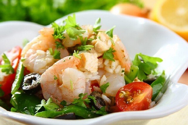 Уже давно не секрет, что креветки хорошо сочетаются со свежими овощами, рисом, мясом птицы, рыбы, зеленью и т.д. Это рецепт салата с креветками и другими не менее вкусными ингредиентами получается достаточно питательный. Насытится им можно буквально одной маленькой порцией. Все ингредиенты просты и доступны. Их количество в салате вы можете выбирать на свой вкус, чего-то добавить больше, а чего-то меньше. Обязательно приготовьте этот салат, он вам несомненно понравится. Ингредиенты для салата с креветками: Приготовление салата с креветками: Для того чтобы приготовить салат с креветками для начала нужно подготовить все ингредиенты. Креветки отварите и очистите. Мясо куриной грудинки отварите, обжарьте на сковородке до лёгкой золотистой корочки и нарежьте кубиком или брусочками. Помидор и перец помойте, вытрите бумажным полотенцем. Теперь помидор нарежьте примерно на 8 частей. Перец очистите от семян и нарежьте соломкой. Лук очистите и нарежьте мелкими кубиками. Оливки нарежьте кружо
