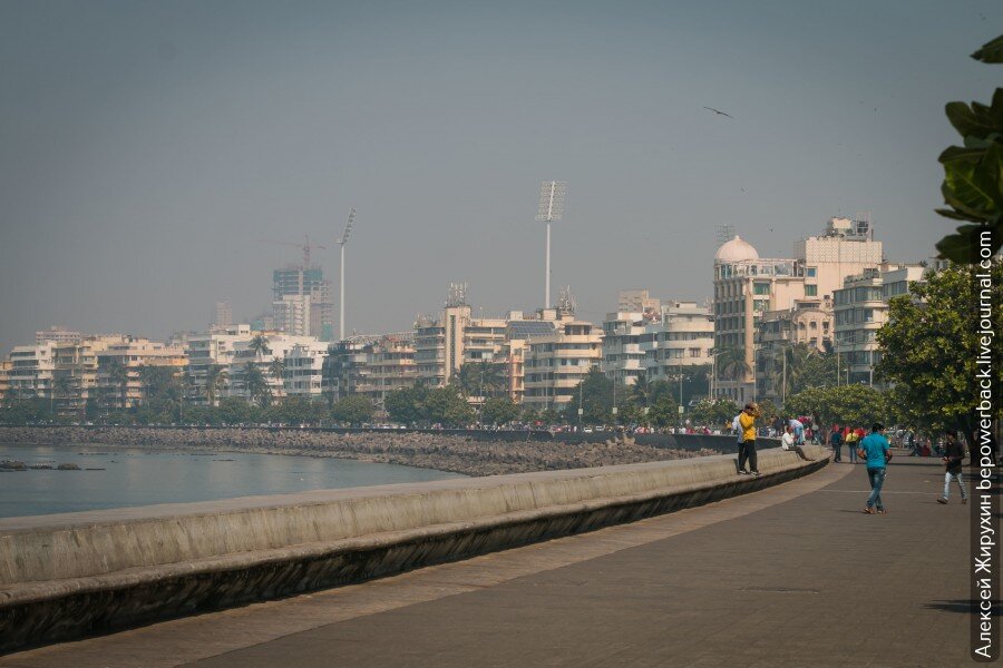 Набережная Марин-Драйв тянется вдоль залива Бэк-бей Аравийского моря, проходя через пляж Чоупатти, и заканчивается на Малабарском холме, где поселились самые обеспеченные люди города. Это, кстати, тоже одна из локаций, которая несколько раз упоминалась в "Шантараме".