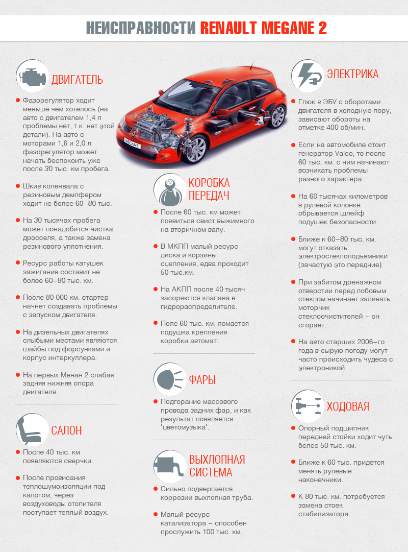 С самого начала своего появления Меган 2 начал покорять сердца автовладельцев. С 2002 года он выпускался в самых разных модификациях: седан, универсал, хэчбэк. В 2006 году он претерпел некоторые изменения внешности, никак не повлиявшие на его технические характеристики – производитель оставил мелкие недочеты без внимания. Рассмотрим. Что это за недочеты и слабые места. Двигатель.