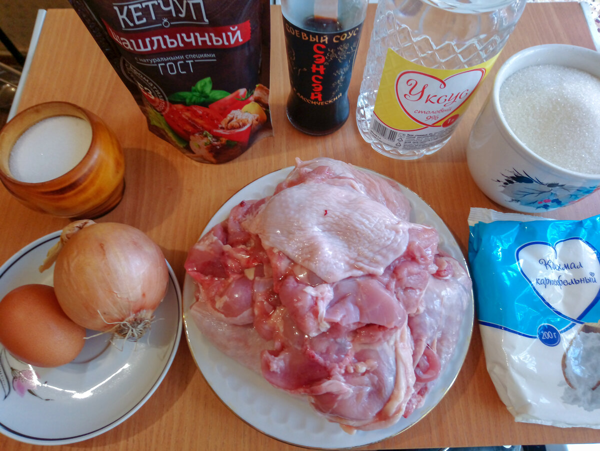 Приветствую Вас, дорогие мои хозяюшки😊 Сегодня мы с Вами будем готовить очень вкусное, нежное мясо в кисло-сладком соусе. Нам понравилось) Надеюсь, и Вы оцените) Ингредиенты: Соус для заливки: Приготовление: Покупаем окорочка и отделяем мясо от костей, снимаем кожу. Либо можно купить как у меня - окорочка безкостные уже. Нарезаем средними кусочками. Складываем кусочки в кастрюльку и добавляем соль и соевый соус. Все тщательно перемешиваем и оставляем на 10 минут. Затем в кастрюлю добавляем 6 ст. ложек крахмала, перемешиваем и оставляем на 50 минут. Далее каждый кусочек мяса обмакиваем во взбитое яйцо, затем в крахмал и обжариваем на растительном масле. Обжаренное мясо складываем в кастрюльку. На оставшемся масле обжариваем луковицу, порезанную полукольцами. Лук добавляем к мясу (без масла, на котором он жарился)и, залив соусом, тушим 5 минут. Вот и все! Наше вкусное мясо в кисло-сладком соусе готово! Приятного аппетита Вам и Вашим близким, дорогие мои хозяюшки!) Если Вам понравился