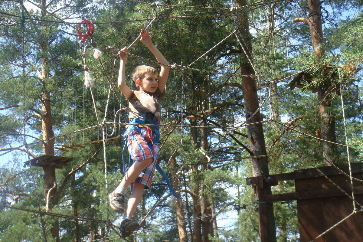 У меня трое детей. Старший Егор - осенний, средний Глеб - летний, младший Кирюшка - зимний. Меньше всего "повезло" Глебу. Ну, с точки зрения ребёнка. День рождения летом это невозможность собрать друзей, которые разъехались по деревням, лагерям и так далее. А праздника детского хочется. Вот и в прошлом году обзвонили школьных друзей - нет никого. Ну, что же, значит семьёй будем отмечать. Как раз в это время мой старший Егор с другом работали помощниками в верёвочном городке. Вот там и решили отметить днюху. В парке, на огороженной территории натянуты три трассы. Пониже - для малышей до семи лет, повыше - средняя, для всех, и оочень высоко - для экстремалов. Мне на третью трассу и смотреть было страшно, а сын с другом прошли её во время работы, хоть бы что. Хорошо, что я этого не видела, а то бы, наверное, рехнулась от страха за него просто. Здесь же на веранде можно шашлычок пожарить. Главное, чтобы погода не подвела. Но нам повезло с ней. Боялась сначала Кирюшку отпускать на тра