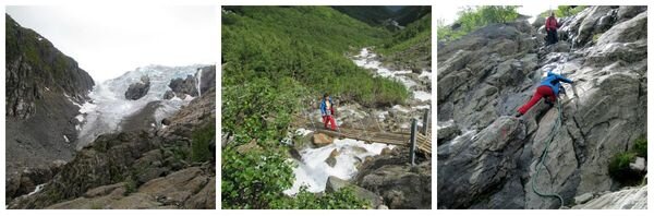 Жаль, что к самому леднику подойти практически невозможно – мост, ведущий прямо в кромке льда снесен потоками воды, а по двум натянутым тросам перебраться можно только при наличии альпинисткой обвязки и карабинов. Такого снаряжения у нас с собой небыло. Поэтому туда мы не полезли. Очень жаль. Но целостность организма дороже – это понимаешь с возрастом. Тем более – в поездке, тем более – по Норвегии. Полюбовавшись на ледник и сфоографировав его на своем фоне, пошли обратно. К 17.30 вернулись в кемпинг. Есть время немного пописать «отчет о путешествии на автомобиле», посидеть в интернете и морально подготовиться к завтрашнему походу на язык Тролля (ссылка на рассказ в конце статьи).