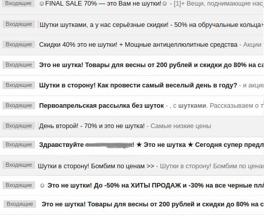 Год за годом многие компании пытаются привлечь внимание своих подписчиков используя разные уловки и хитрости в темах писем. Но почему-то в емейл-рассылках к первому апреля очень часто можно встретить картину, где заголовки очень похожи друг на друга. Только взгляните на скрин из моей почты: