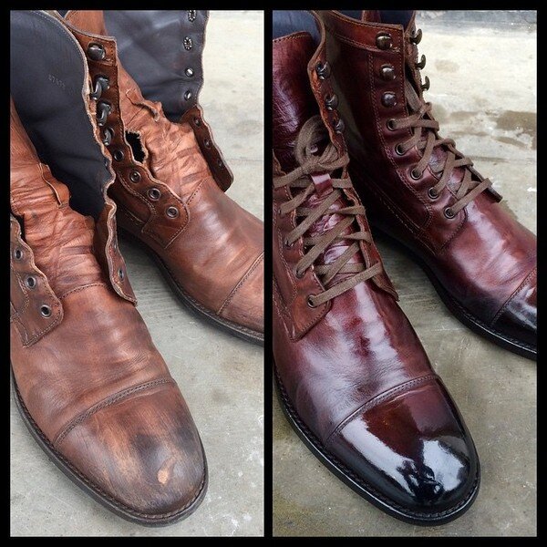 Сразу после покупки желательно обработать обувь кремом и воском. Опять же, использовать дешевые средства я бы не советовал. Настоящий крем для обуви, содержит растительные масла, которые размягчают и питают кожу, особенно это актуально зимой. Из-за соли, реагентов и мороза кожа дубеет, высыхает и особенно, нуждается в увлажнении. Также, крем помогает обновить и освежить цвет обуви. Крем лучше выбирать в тон цвета кожи. Бесцветный крем, можно, как смешивать с темными оттенками, для создания необходимого цвета, так и использовать отдельно (но не слишком часто). Для нанесения крема можно использовать зубную щетку или хлопчатую ткань (например, от старой рубашки), т.к. такая ткань не ворсится. После нанесения крем должен высохнуть естественным путем где-то 15-25 мин, после чего его излишки с обуви можно смахнуть обувной щеткой с натуральным ворсом. Воск - наносится после крема и создает защитный слой на коже. Так же при помощи гуталина можно сделать отличный гласаж. Гласаж - особая техника полировки мыса обуви до зеркального блеска, см. фото ниже.