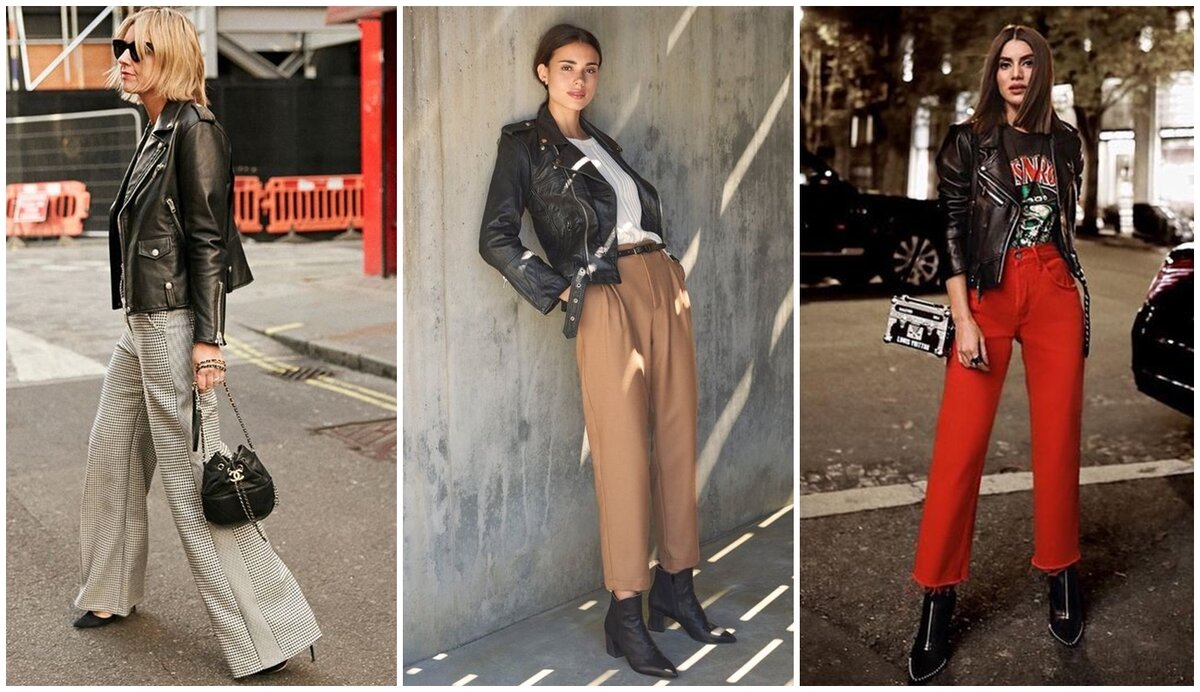 Кожаная куртка-косуха – один из самых базовых предметов гардероба на межсезонье. Сегодня разберем, как носить ее актуально и нескучно. Прежде всего, хочу обратить ваше внимание на то, что современный фасон кожаной куртки – слегка свободный, не в обтяжку, прямого кроя и с небольшим эффектом оверсайз (по желанию). С брюками Самый простой и банальный вариант – это носить косуху с джинсами. Если же хочется оригинальности и разнообразия – попробуйте перебороть стереотипы и сочетать ее с более классическими фасонами брюк, притом желательно не черного цвета. Куртка сразу же заиграет новыми красками. С мини Хочется немного дерзости и откровенности? Если фигура позволяет – то смело внедряйте в повседневные образы сочетание косухи с мини! Главное – правильно подобрать обувь. Ботильоны на шпильке и платформе лучше оставить на другой случай, а вместо них надеть актуальные кроссовки, казаки, сапоги-трубы или ботинки на шнуровке. С миди Очень стильное и элегантное сочетание, которое обязательно ст