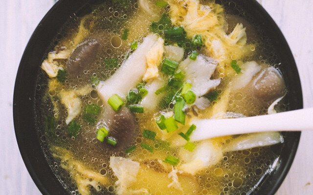 Поднимите огонь и залейте взбитые яйца. В то же время, размешать суп быстро или медленно. Когда яичная мука образуется, выключите огонь. Добавьте кунжутное масло и щепотку соли, а затем хорошо совместите.