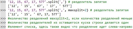 мaxsplite – максимальное количество(т.е не более чем мaxsplite раз, меньше можно) раз на которое будет разбита строка. По умолчанию maxsplite=-1. «-1» обозначает не ограниченное количество разбиений. Если мaxsplite меньше количества разделителей в строке, то из оставшегося куска строки получается один элемент списка.