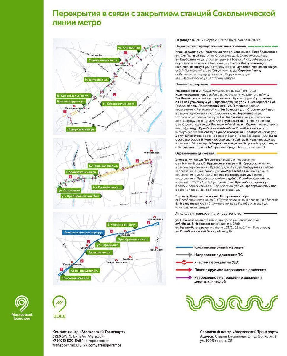 В Москве в эти выходные закрывают сразу шесть станций метро, а кроме того, на ЖД вступает в силу летнее расписание. Ну и по мелочи - пара перекрытий и новые остановки у автобусов. Итак, завтра, 30 марта, закрывается (снова) участок Сокольнической линии от Бульвара Рокоссовского до Комсомольской для прокладки второго тоннеля Большой Кольцевой линии. Тайминги все сохранились на специальном телеграмм-канале Сокольническая закрыта , там же с завтра начнём публиковать ваши новые тайминги, впечатления и приключения на тему «Как я доехал на работу при закрытом метро». Все будет, как и в прошлый раз - вместо метро автобус КМ, бесплатный трамвай № 13 и МЦК. Комсомольской лучше избегать, она будете перегружена. Обратите внимание, на время закрытия переносятся остановки областных автобусов №860 и №1251к - в Москве их конечная временно переезжает от Черкизовской к Щелковской. Максимально-исчерпывающая и постоянно обновляющаяся информация о маршрутах и перекрытиях в специальном разделе на са