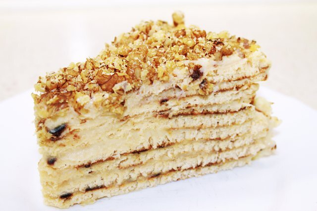Ингредиенты: Коровье молоко - 500 г Ванилин - 4 г Мука пшеничная - 510 г Молоко сгущенное - 350 г Грецкий орех - 200 г Яйцо куриное - 3 шт. Сахар тростниковый - 2 ст.л. Сливочное масло - 200 г Разрыхлитель - 5 г Приготовление: Так как коржи пекутся очень быстро, нужно сначала приготовить заварной крем. В сотейник добавить молоко, 2 куриных яйца, тростниковый сахар, 60 г. муки, сахар и поставим на очень медленный огонь. Все перемешиваем и даем закипеть на очень низком огне, периодически помешивая. Когда крем закипит и загустеет, добавим сливочное масло и снимем с огня. Пока крем готовится, приступим к приготовлению коржей. Разогреваем сразу сковороду на среднем огне. В миску добавляем сгущенку, 1 куриное яйцо, разрыхлитель. Перемешиваем, затем 350 г. просеянной муки, и все перешиваем. Добавим еще 100 г. муки и замешаем тесто руками, разделим тесто на 8 равных частей. Раскатаем каждую часть. Выпекаем на сковородке полторы минуты каждый корж без, добавления масла. Грецкие орехи р