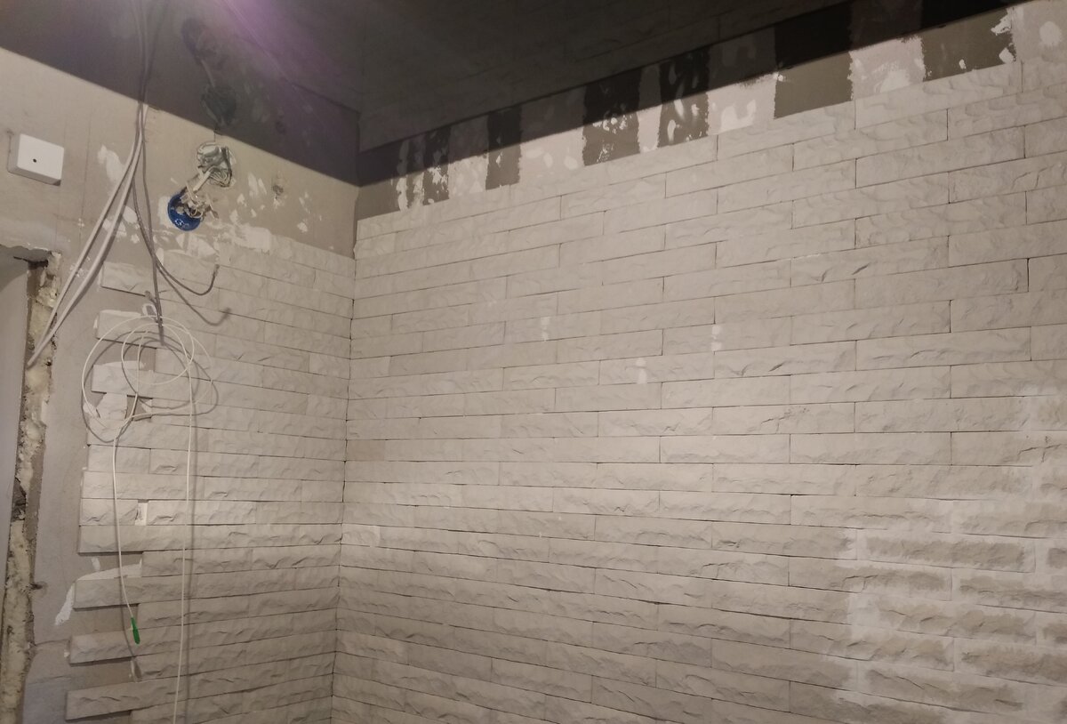 Не так давно знакомый купил квартиру и делает в ней сам ремонт, был у него в помощниках и хочу рассказать как он выкладывает гипсовую плитку под кирпичики на стену в прихожей. А решил он делать это сам так как за работу ему предложили 1200 рублей за метр квадратный, ему это показалось дорого. Общая площадь покрытия плитки получилась чуть больше девяти квадратов, арифметика простая 9*1200=10800 руб. Вот и решил посидеть в выходные у себя на квартире и поработать. На самом деле данное занятие - не такое и простое как может казаться на первый взгляд. Вся плитка разного размера и приходится делать очень много подрезок. Процесс укладки такой: сначала выставляет лазерный уровень, выкладывает первый ряд, переносит уровень дальше на один ряд и так далее. Укладывает плитку на гипсовую штукатурку. Данная плитка имеет толщину 5-7 мм, так как она сделана из гипса то очень хрупкая и работать с ней нужно аккуратно. Торец стены вообще отдельная история, пришлось сводить швы обоих стен и подпиливать