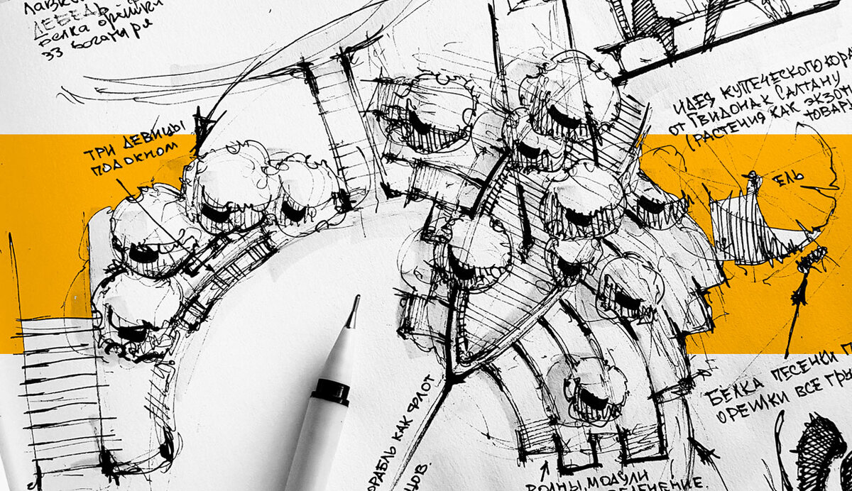 Сперва сам лист с концепцией. Ландшафтный дизайн для площадки размером примерно 10 - 12 метров. Идея для дизайна - " Сказка о царе Салтане, о сыне его славном и могучем богатыре князе Гвидоне Салтановиче и о прекрасной царевне Лебеди"