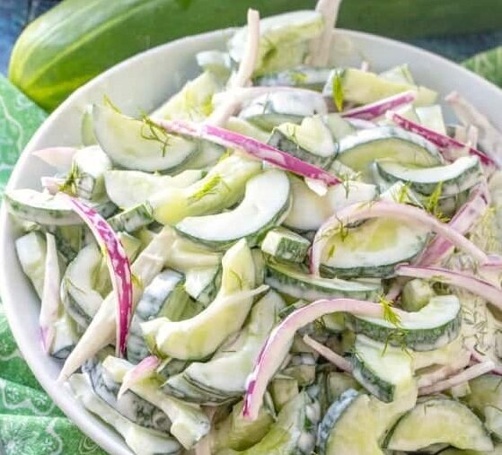 Сливочно-огуречный салат состоит из свежих огурцов, сметаны, майонеза и свежего укропа. Легкий летний салат! Время приготовления: 1 час 10 минут Количество порций: 6 Калорийность блюда: 107 ккал Ингредиенты: 2 длинных огурца; 1/2 стакана нарезанного красного (или белого) лука; ½ чашки сметаны; 3 столовые ложки майонеза; ¼ чашка свежего нарезанного укропа; 3 столовые ложки белого уксуса; ½ чайной ложки сахара; соль - по вкусу. Фоторецепт пошагово: Шаг 1: Разрезаем огурцы вдоль на две половинки, вычищаем семена и режем на тонкие ломтики. Режем лук. Складываем нарезанные овощи в миску. Шаг 2: Смешиваем все ингредиенты, предназначенные для заправки салата: сметану, укроп, майонез, уксус, соль, сахар. Шаг 3: Добавляем заправку в овощи, перемешиваем и отправляем салат на 1 час в холодильник Салат готов! Приятного аппетита! Пищевая ценность: Калории: 107 ккал | Углеводы: 5 г | Белок: 1 г | Жир: 9 г | Насыщенные жиры: 3 г | Холестерин: 12 мг | Натрий: 63 мг | Калий: 207 мг | Сахар: 3