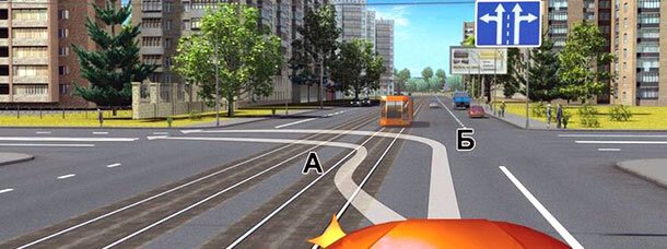 И так, мы находимся на перекрестке и хотив выполнить поворот налево. На рисунке изображены два варианта поворота. По какой же будет правильно, не нарушая правила дорожного движения. На данном перекрестке так же установлен знак, который указывает направление движений. И на нем показано, что поворот налево возможет только по траектории Б. Если же такого знака нет, значит поворот возможен по обеим траекториям.