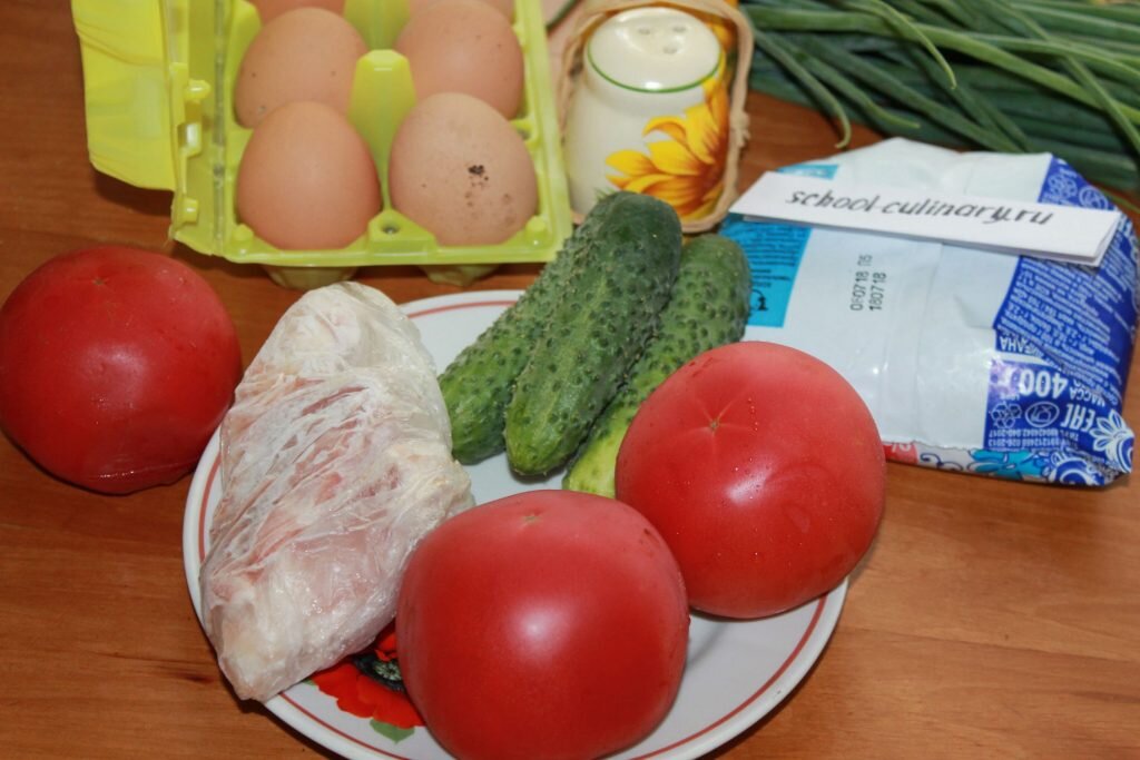 Если намечается застолье или прием, каждому гостю можно подать порционный салат в креманках. Гармоничное сочетание вареной крицы со свежими огурцами, зеленым луком, яйцами и помидорами заправляется майонезом. После измельчения компоненты выкладываются слоями. Блюдо выглядит аккуратно и эффектно. Кусочки свежих томатов, разбросанные сверху, немного зеленого лука – и на столе свежий сочный праздник для хорошего аппетита. Ингредиенты: Приготовление Нарезаем продукты. Вареную курицу разбираем на волокна после охлаждения. Зеленый лук ополаскиваем и нарезаем. Огурцы моем, режем соломкой. Яйца куриные отвариваем вкрутую, чистим и режем кубиками. Помидоры моем, нарезаем кусочками. Собираем салат. Готовим чистые сухие креманки. На дно каждой кладем каплю майонеза. Курицу делим на две части. Ее будет в каждой креманке два слоя. Насыпаем один куриный слой, солим, перчим и поливаем майонезным соусом. Выкладываем огурцы, порезанные соломкой. Сверху на них высыпаем по горсти измельченного зеленого