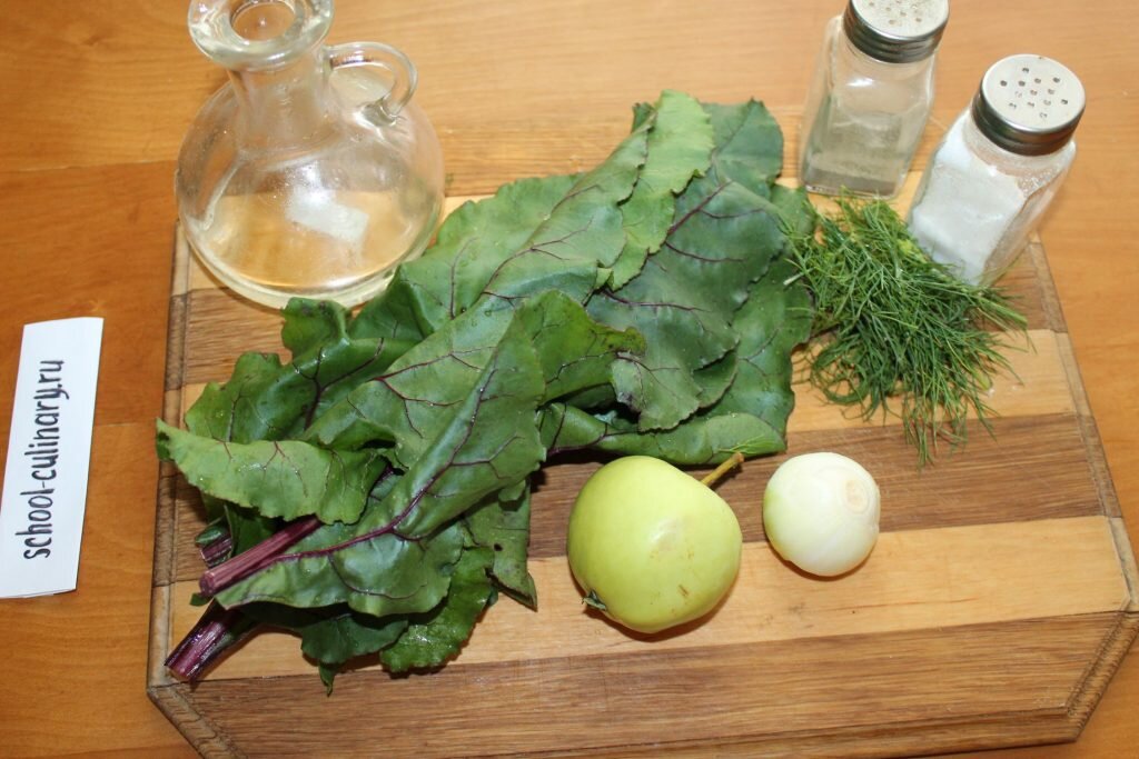 Фейерверк витаминов и минералов в оригинальном летнем блюде. Салат с зеленым яблоком впечатляет палитрой вкусов и ярким изумрудным цветом. Минимум компонентов, которые можно найти в любом холодильнике, обеспечивают отличный кулинарный результат. Хозяйка получает интересное блюдо с пикантным вкусом на обед или в качестве легкого ужина. Домашние заряжаются пользой самой природы, сохраненной в зеленом яблоке, свекольной ботве, луке и укропе. Ингредиенты: Приготовление Свекольную ботву берем помоложе из середины пучка. Отлично подойдет та, которую только что срезали. Черешки отрезаем. В ход пустим лишь листочки. Стебли же можно пожарить или использовать для приготовления соуса. Листья исследуем, чтобы под ними не спрятались вредители или элементы их жизнедеятельности. После хорошо моем и просушиваем. Укроп также ополаскиваем и стряхиваем воду. Яблоко моем, просушиваем. Репчатый лук очищаем и ополаскиваем. Для цвета и более мягкого вкуса можно использовать красный лук. Если хочется поучит