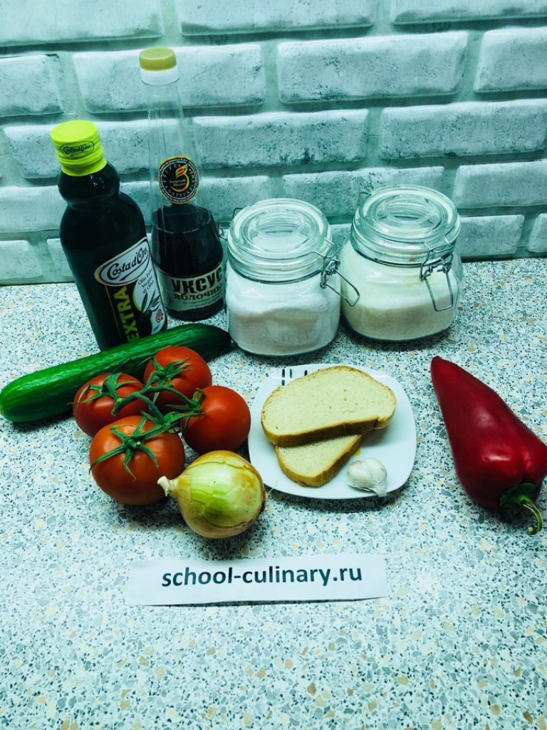 Лёгкий холодный суп из перетёртых в пюре свежих овощей освежит вас в жаркий летний день Ингредиенты: Соль, сахар - по вкусу Промываем и нарезаем помидоры Сладкий перец избавляем от семян, нарезаем большими кусками Промываем и чистим огурец от кожуры Добавляем крупно нарезанные огурцы в чашку с помидорами и перцем Обрезаем корочки у хлеба, нарезаем кубиками мякоть и добавляем к остальным ингридиентам Чистим и режем чеснок и лук Добавляем яблочный уксус и оливковое масло. Перемешиваем. Оставляем настояться 10 минут. Измельчаем все ингридиенты с помощью блендера до состояния пюре Процеживаем полученную смесь через сито чтобы избавиться от кожуры и семечек Переливаем суп в тарелку, украшаем нарезанным огурцом