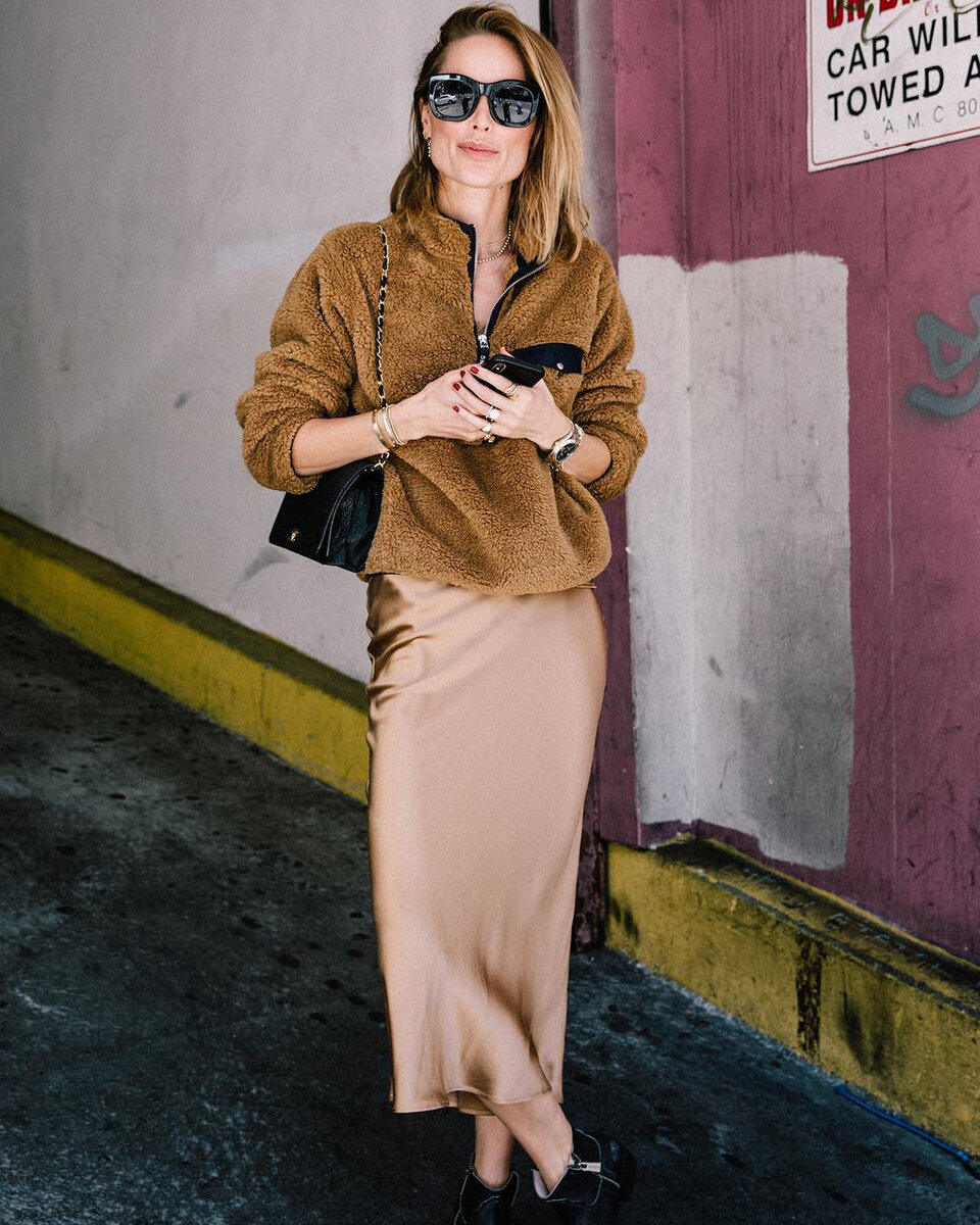 Струящиеся юбки А-силуэта из шелковистых тканей можно носить и сейчас, а позже вписать в осенне-зимние образы. Уже сейчас можно носить такие модели с объемными джемперами, а летом сочетать с простыми футболками, укороченными топами и блузами. Сверху в случае прохлады предлагаем накинуть свободный пиджак или джинсовку.