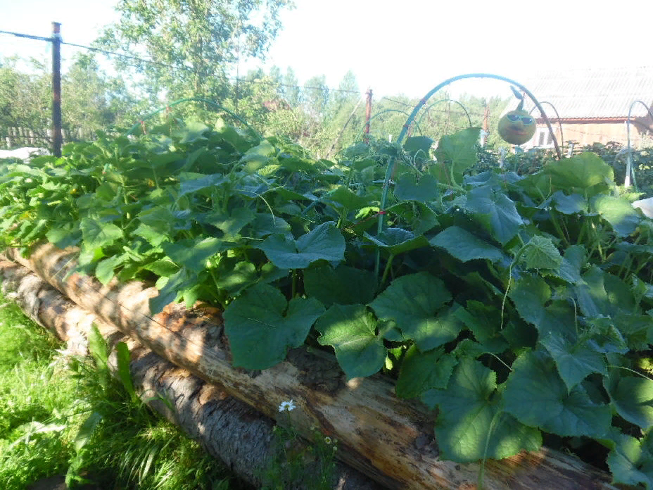 Приветствую читателя.Хочу рассказать как и почему мы сделали теплые гряды-и какие результаты дало творчество.Огород у нас в ширину примерно 15 метров и длина около 50 метров.середину разделяет тропинка шириной 1 метр. По сторонам расположены гряды и если по ходу по правую руку гряды сухие то по левою всегда повышенная влажность и что бы обработать надо приложить усилие,и после дождей земля на левой стороне моментально сплывается и бетонируется.Сажали клубнику первый год вроде нормально,на второй год гряды выравнивались с уровнем участка а к осень уже их заливало.Вот и и пришло решение устроить там теплые гряды.Из доступных нам материалов наб был только кругляк ели который в округе по делянкам валяется в неограниченном количестве. Были срублены срубы под гряды 5на 1.5 метра в количестве 3 шт.и высотой 50-60 см.Ям я не копал и прямо на землю положил остатки вершинника и горбыля и пространство пересыпал опилками это примерно на 25см.Потом пошел в ход навоз и все верхнюю подушку из приво