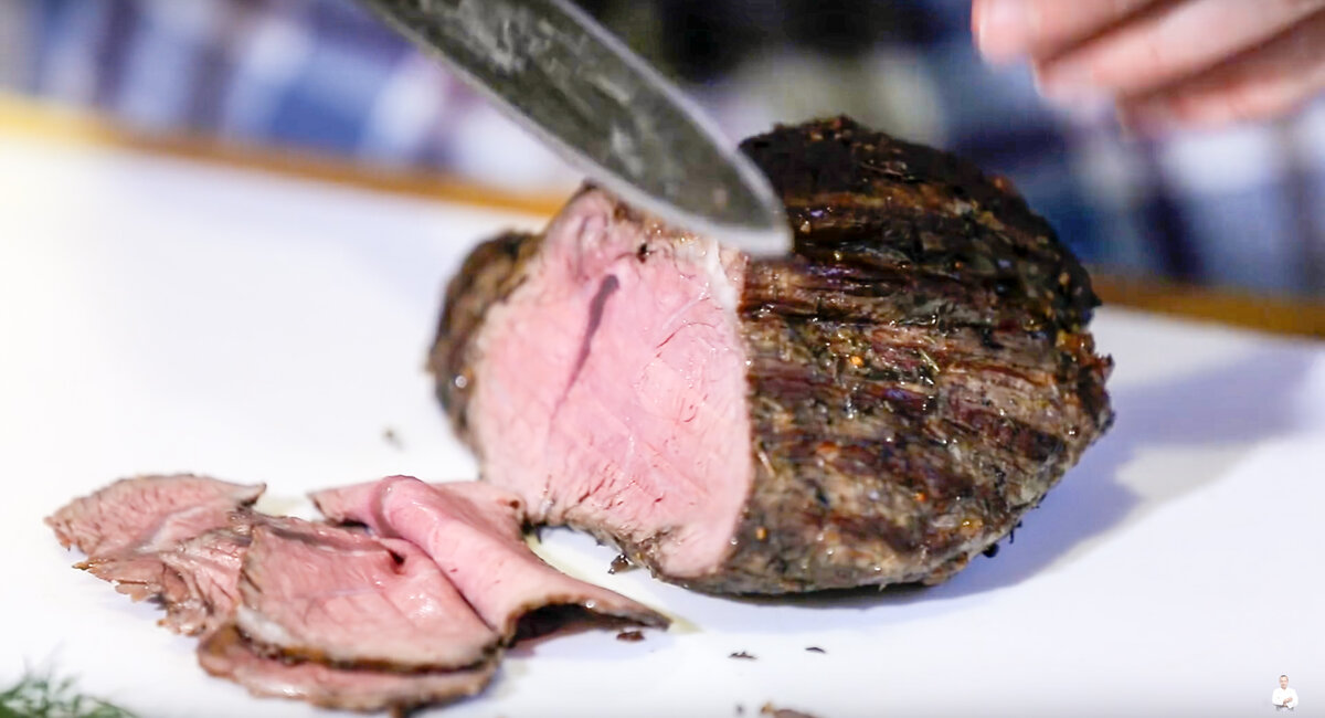 Некоторые тонкости приготовления ростбифа помогут нам сделать его нереально вкусным и очень сочным. Ингредиенты: Ростбиф Смесь специй для гриля Растительное масло Чеснок Сухой тимьян Приготовление: Ростбиф в мире мясоведения еще называют кострец - это верхняя часть задней ляжки, большой такой кусок мяса и, кстати, он дешевле, чем вырезка. Перед тем, как готовить ростбиф или стейк, заранее нужно достать мясо из холодильника и дать ему полежать при комнатной температуре, чтобы оно нагрелось. Если мясо будет холодным, то верх пересохнет, а внутри оно останется сырым. Сначала мы должны ростбиф замариновать. Можно в той же посуде, в которой будем запекать. Растительным маслом обмазываем мясо со всех сторон, чтобы создать клейкую оболочку. Посыпаем сухим тимьяном, смесью специй для гриля (можно взять любые специи для мяса) и, обильно посыпав солью, добавляем мелко нарезанный чеснок. Все специи распределяем по мясу. На раскаленную сковороду-гриль отправляем мясо. Обжарив его со всех сторон, п