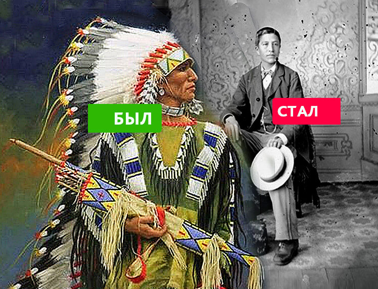 Посмотрите на правую часть, где фотография. Сидит парень, одет интеллегентно, стрижка короткая - настоящий американец, одним словом. Не правда ли? На фотографии Лютер Стоящий Медведь - сын вождя из племени лакота. Но почему он одет не как вождь? Однажды, после длительной войны коренных американцев - индейцев с гостями из Европы, первые осознали своё проигрышное дело. Многие боролись до конца и гибли. Некоторые из них пошли на компромисс с захватчиками: вожди сложили оружия, пошли в жить резервации, а детей отправили в "цивилизованные" школы. Так вот, Лютер Стоящий Медведь (1868 - 1936) - сын вождя, с детства попавший в такую школу, оторванный от воспитании Отцом, соплеменниками. Он не впитал в себя древние индейские обычаи, жизнь на Природе, дыхание Свободы. С самого детства Лютер окунулся в жизнь белых американцев. Стал образцовым учеником и скоро стал заниматься привлечением новых учеников. Вот она - кровь вождя! Даже забыв свои корни, забыв кто он, его природный Ум, его качества ост