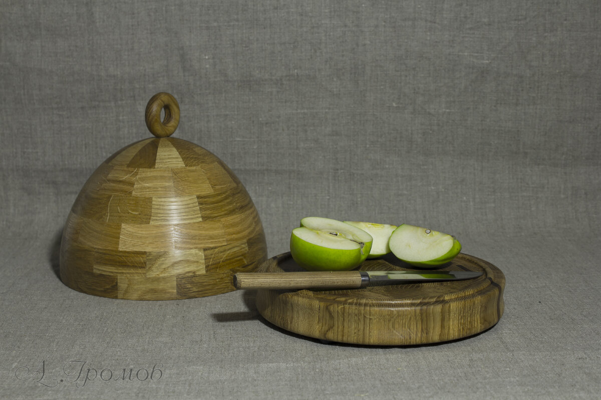 На кухне все должно быть идеально. Приготовление пищи, подача на стол, принятие пищи - все должно приносить удовольствие. Поэтому те, кто любит хорошо поесть и те кто любит готовить (обычно это одни и те же люди) пользуются хорошо заточенными ножами, кастрюлями и сковородками с антипригарным покрытием и конечно разделочными досками. А лучшая разделочная доска - это торцевая доска. То есть волокна дерева расположены торцом вверх. Это предохраняет ножи от быстрого затупления. Такая доска прослужит намного дольше обычной. И в конце концов, вам не придется есть еду с кусками дерева. Как токарь по дереву, я естественно сделал себе круглую доску. Так делают многие, но я пошел дальше и сделал крышку. Теперь у моей доски из дуба есть крышка из дуба. Я уже писал про масленку из дерева, в которой удобно подать еду прямо в ней. С этой доской тоже самое - порезал и сразу на стол. Очень удобно и красиво. У нас на кухне несколько торцевых досок, от маленьких до больших. И за всеми ними нужен ухо