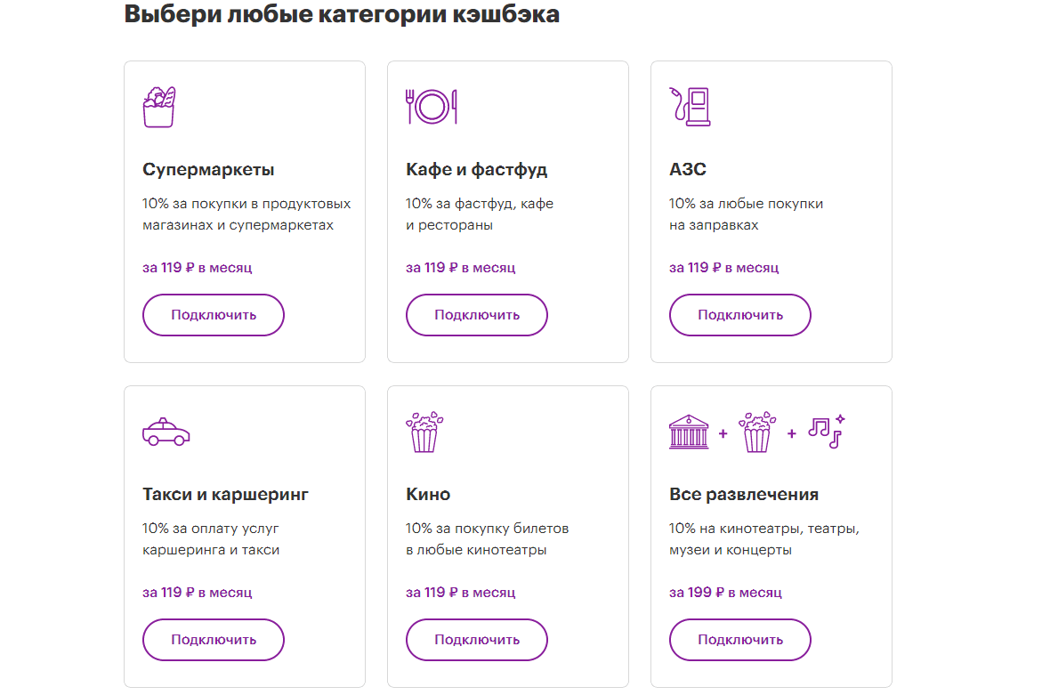 У карты есть семь категорий 10% кешбэка (Супермаркеты, Кафе и фастфуд, АЗС, Такси и каршеринг, Кино, Музеи, Все развлечения). Каждую из первых шести можно подключить за 119 рублей в месяц, категория Развлечения (Кино, Театры, Музеи, Концерты) подключается за 199 рублей в месяц.