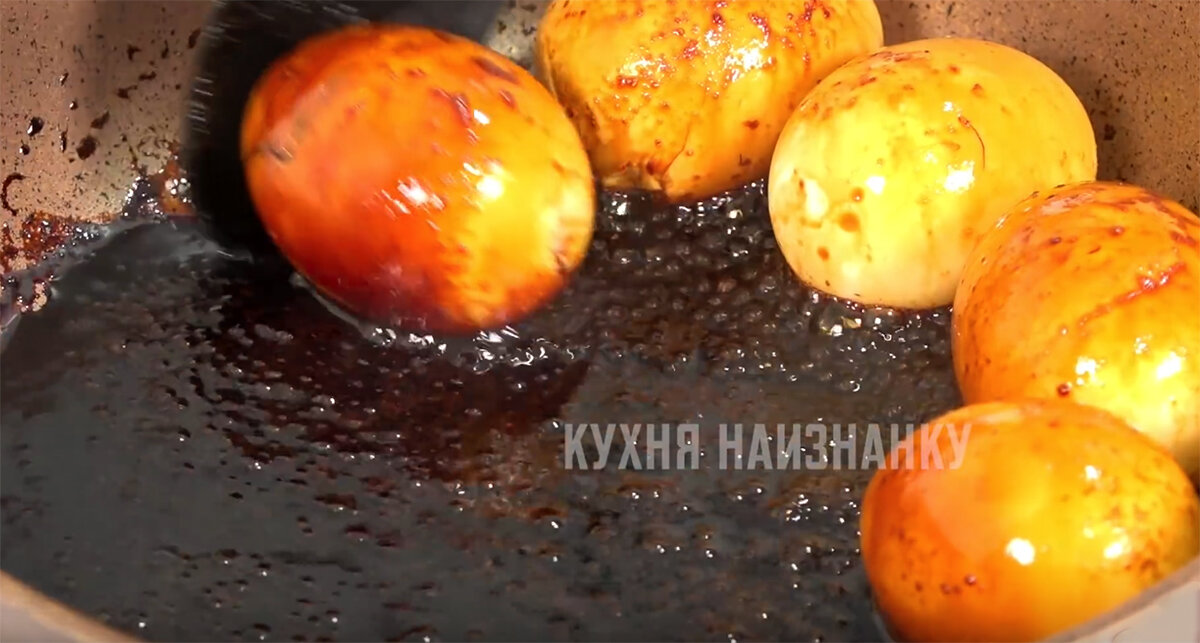 Чаще всего после Пасхи, когда остается много вареных яиц, я готовлю яйца в соевом соусе. Очень простая и очень вкусная закуска, которую даже на праздничный стол иногда подаю. Всего 5-7 минут - и готово! В видео ниже на 11:19 можно посмотреть, как я это делаю. Там же еще очень много разных способов, как я готовлю яйца на Пасху, несколько экспериментов и способ, как красиво украсить яйца без луковой шелухи и красок. Посмотрите - вам понравится)) На сковороду наливаю 2-3 ст.л. воды, 2 ст.л. соевого соуса, чайную ложку коричневого сахара, молотый имбирь 1/3 ч.л., мускатный орех щепотку, немного сухого чеснока и одну гвоздичку. Пряности и приправы, конечно, можно взять на свой вкус. Перемешиваю и выкладываю в соус вареные и очищенные яйца. Готовлю, постоянно переворачивая, 5-7 минут. Вот, что получается. Очень красивый насыщенный цвет, яркий аромат. Сладко-солено-пряный вкус белка в сочетании с нежным желтком... Это необычно и вкусно)) Смотрите также: