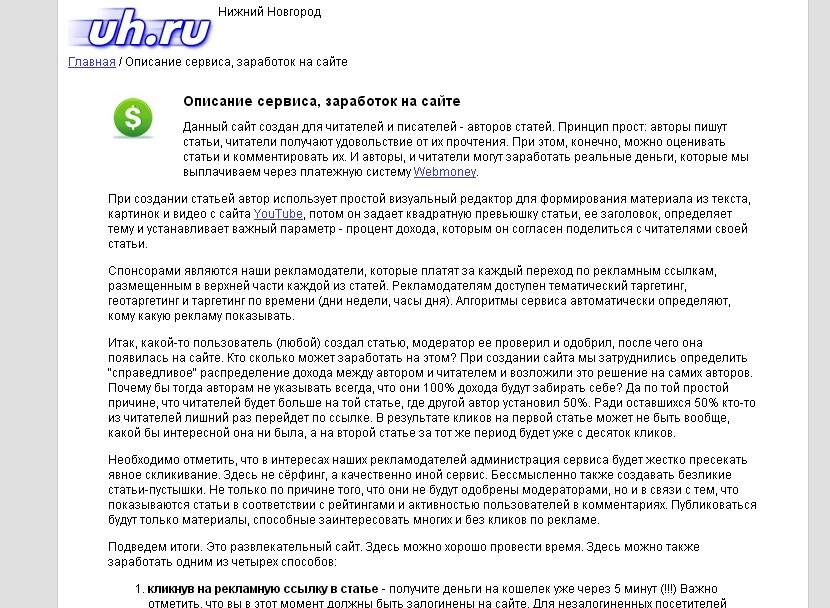 Лже-заработок в интернете. Обходите мимо http://uh.ru/info/ Схема развода простая. Вы смотрите за сущие копейки их рекламу, дай бог за месяц упорно набьёте 10-15 руб. Клики не всегда даже считают, там ребята ушлые. Тех.поддержка не отвечает и никогда ничего не объясняет. Клик стоит до 0.03 руб. и меньше, чем обещают в их правилах и условиях. Кидают как хотят без предупреждения. Иногда, дают заработать, 1, 2 раза максимум, на 3-й раз точно кинут (заблокируют). Деньги выводят на WEBMONEY кошелёк с огромным грабительским процентом. Проверено лично. Подобный сайт такого же мнимого заработка http://wm-seo.ru/ Но отличии от вышеуказанного, эти начисляют вам эти же копейки за то же время, но при выводе будут проблемы, и деньги останутся на сайте, а вы будете лицезреть только на них, как они копятся, а снять никак нельзя. Та же схема вывода через Вебмани Кошелёк. А вы тупо будете делать просмотры кому-то, а деньги будет получать их система. Но тех.поддержка отвечает и письма-оповещен