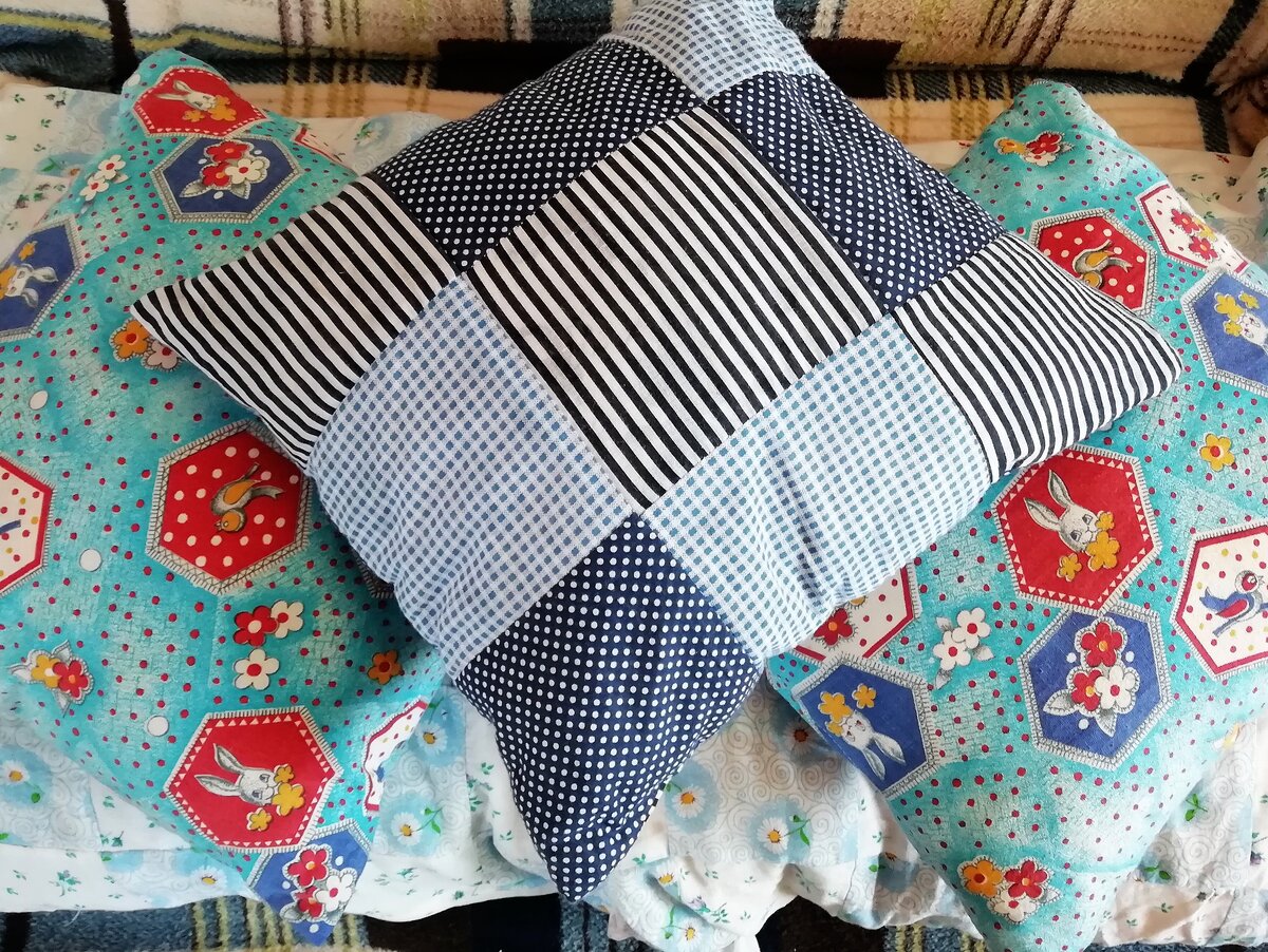 Некоторое время назад я проводила у себя дома глобальное расхламление, в результате которого было вынесено несколько мешков ненужных вещей или просто мусора. В один прекрасный момент я добралась и до ящика, в котором хранится все для рукоделия. Без сожаления я выбросила и раздала все маленькие моточки пряжи и погнутые спицы. Но большую часть этого бездонного ящика занимали старые дырявые джинсы супруга в количестве 15-20 штук. Они копились там на протяжении нескольких лет, и уже основательно меня раздражали. Поэтому решено было разрезать их на полоски одинаковой ширины, и собрать из них плед. Так же оттуда были изъяты куски ткани еще советских времен, которые я забрала у мамы. Из них я сшила наволочки для больших и маленьких подушек. В доме нашлись и старые подушки, которые перестали выполнять свою функцию (муж говорил, что "на этих носовых платках уже невозможно спать"). Из них я и собрала небольшие декоративные подушечки. В маленьком размере они стали гораздо плотнее. Вот что у м