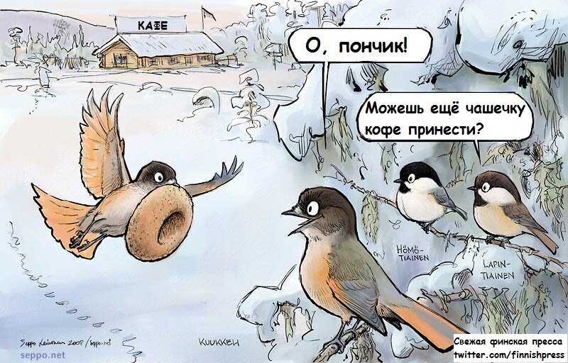 Финский художник-иллюстратор Сеппо Лейнонен - человек природы, и множество своих рисунков посвящает лесу, птичкам и другим животным (в частности людям :)). Вот ещё несколько его работ. Смотрите также: Финские карикатуры про природу, в том числе человеческую: Сеппо Лейнонен Финские карикатуры про Трампа, Путина и прочих - на русском
