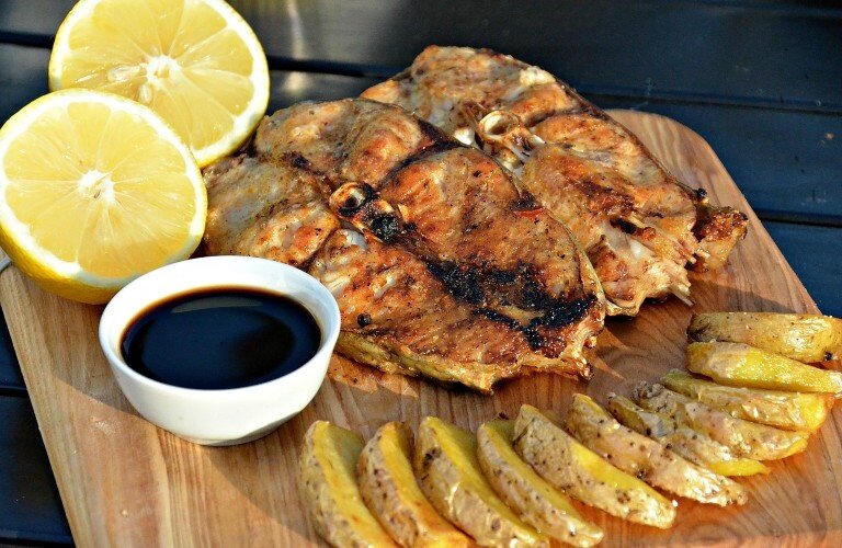 Удалить сома из маринада; жарить на гриле или жарить 4 минуты с каждой стороны, или до тех пор, пока зубатка не начнет шелушиться вилкой. Делаем 4 порции.