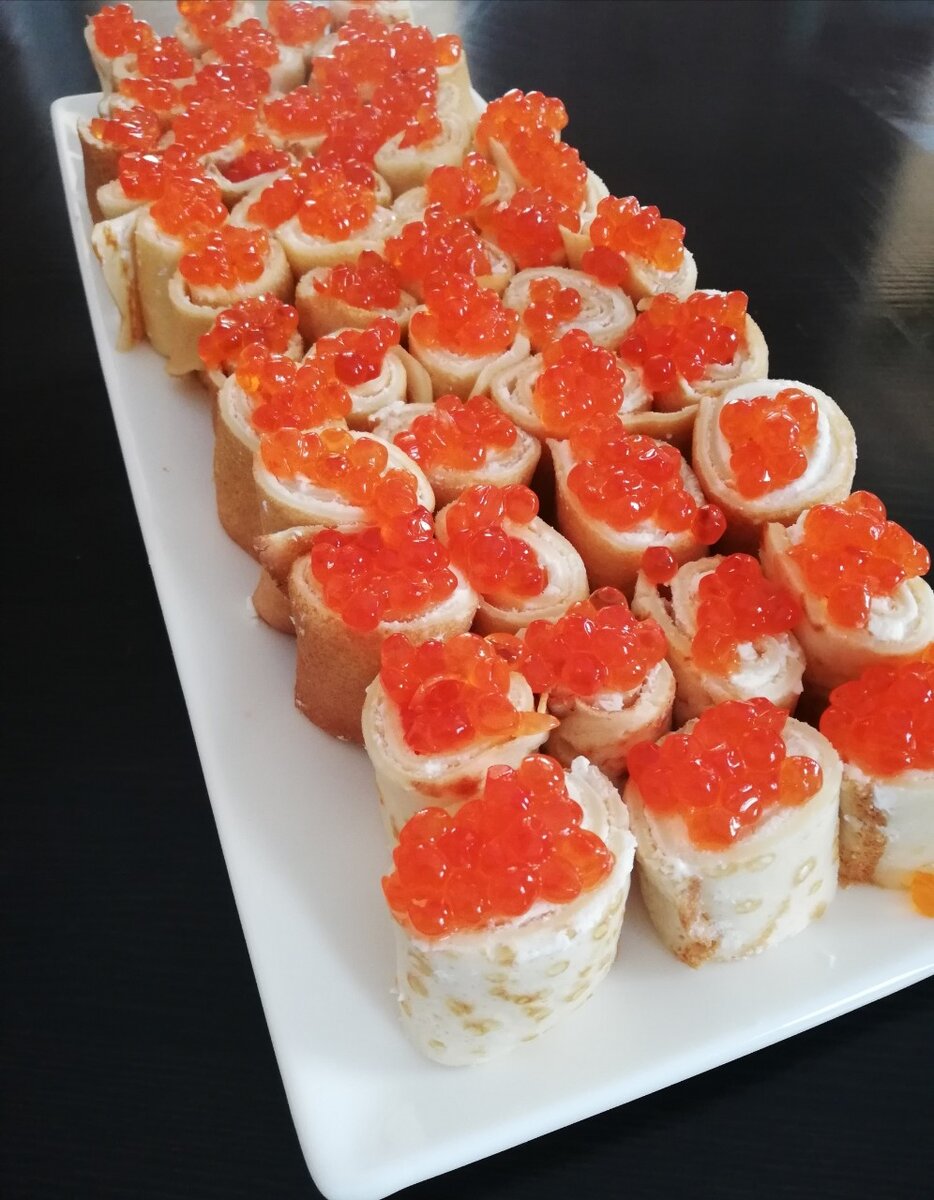 Всем привет! Я очень люблю готовить и даже в гости хожу с угощениями, которые приготовила сама:) И вот к очередному походу к знакомым муж попросил приготовить блинчики с икрой ( ведь на дворе стояла масленичная неделя) . Просто блинчики - мне показалось скучно и я решила сделать роллы. Мало того, что красная икра радовала глаз своим сочным цветом - ведь ролл получилось большая тарелка, так еще, поверьте, друзья, они получились такие вкусные, что разлетелись в миг! Итак, приготовим блинчики!