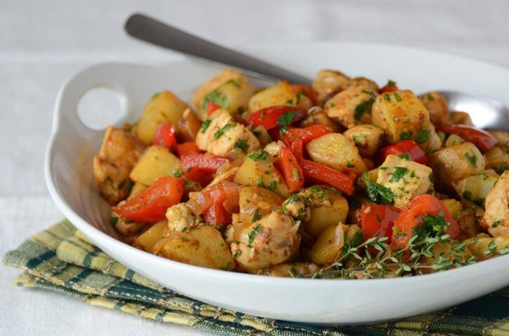 Данный рецепт - отличный вариант блюда для горячего обеда или ужина. Легкое мясо индейки и овощи быстро усваиваются и хорошо насыщают! Время приготовления: 50 минут Нам потребуется: •Индейка (филе и бедра) - 300 гр •Морковь - 1 шт. •Лук репчатый - 1 шт. •Болгарский перец - 1 шт. •Помидор - 1 шт. •Кабачки 200 гр •Оливковое масло - 2 ст. ложки •Перец горошком - 3 шт. •Вода - 200 мл •Соль по вкусу Процесс приготовления: Для начала мясо индейки следует нарезать на небольшие кусочки и промыть. Если готовите на большую семью, то можете использовать тушку индейки целиком. Для обеда поменьше и части, например филе или пары бедрышек. Лук и морковку почистить, нарезать на мелкие кубики. Кабачок моем, очищаем от кожицы, вынимаем мякоть с семенами. Также режем на маленькие кубики. Также можно поступить с помидорами, если вам не нравится когда в блюде попадается кожура от них. Вычищаем сердцевину болгарского перца и нарезаем его соломкой. Зубчики чеснока нужно очистить от шелухи и мелко нарубить.