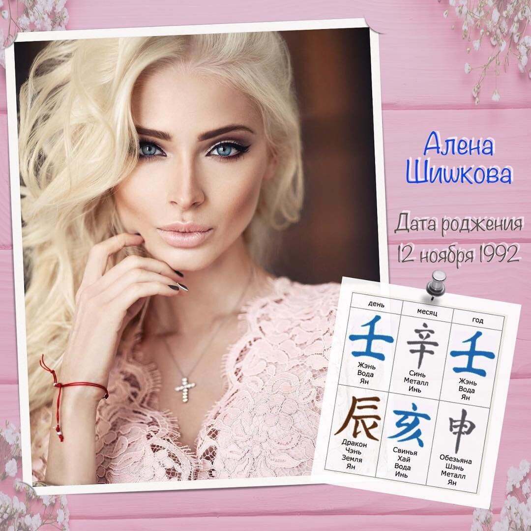 В карте Алены очень много воды. Вода в женской карте - очень хороша, такая женщина умеет ценить себя и ставить свои ценности на первое место, она умеет быть изобильной и наполненной изнутри. Женщина, в карте которой много воды, сохраняет верность своей женской природе и испытывает естественную потребность заботиться о себе. Мощная вода в карте указывает на сильную интуицию и способность хорошо чувствовать людей. Но все должно быть уравновешено, вода без огня - лёд. У Алёны холодная карта Ба-Цзы и в тактах удачи огня так же недостаёт. Уравновешенная стихия огня даёт веселый нрав и легкость общения, когда у людей есть огонь с ними тепло и уютно. По году рождения 壬申 Алена сентиментальна, меланхолична, склонна к ностальгии и не очень дружелюбна. Зато в дне рождения 壬⾠ у неё мой любимый Куйганг. Девушка амбициозна, активна, внешне может выглядеть слабой, но внутри у неё у неё очень прочный стержень, дающий устойчивость к проблемам и жизненным препятствиям. Алена хочет быть первой всегда