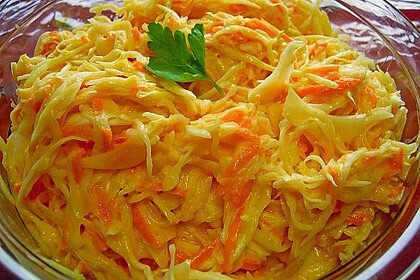 Ингредиенты: 400 г белокочанной капусты 1 большая морковь 50 мл уксуса 1 столовая ложка сахара 1 столовая ложка муки 1 ч. Ложка семян горчицы, молотая 1 чайная ложка соли 80 мл сливки 2 столовые ложки масла 1 большое яйцо Приготовление: Белую капусту нарезать тонкими полосками, очистить и натереть морковь. Доведите до кипения уксус, сахар, горчичный порошок и соль, добавьте муку при перемешивании. Положите на сливки и масло и снимите с огня. Добавьте яйцо, помешивая, пока масса не загустеет. Затем смешать с капустой . Оставьте на 3 часа!