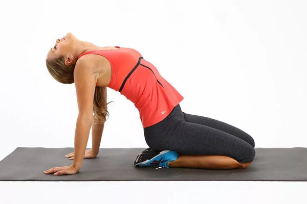 Разведите руки назад, развернув ладони к бедрам так, будто вы собираетесь на них опереться. Поднимите голову вверх, тяните подбородок. Повторяйте движение в течение 3 секунд.