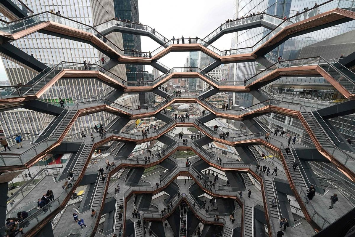 Возвышающаяся в воздухе на фоне небоскребов Нью-Йорка, эта недавно открытая общественная достопримечательность Манхэттена напоминает гигантскую соту. Многослойная дорожка стоимостью 200 млн. Долларов США (271 млн. Долл. США) является центральным элементом Hudson Yards, грядущего мегапроекта города, в который войдут магазины и рестораны мирового класса, современные жилые дома и офисы. и роскошный отель.