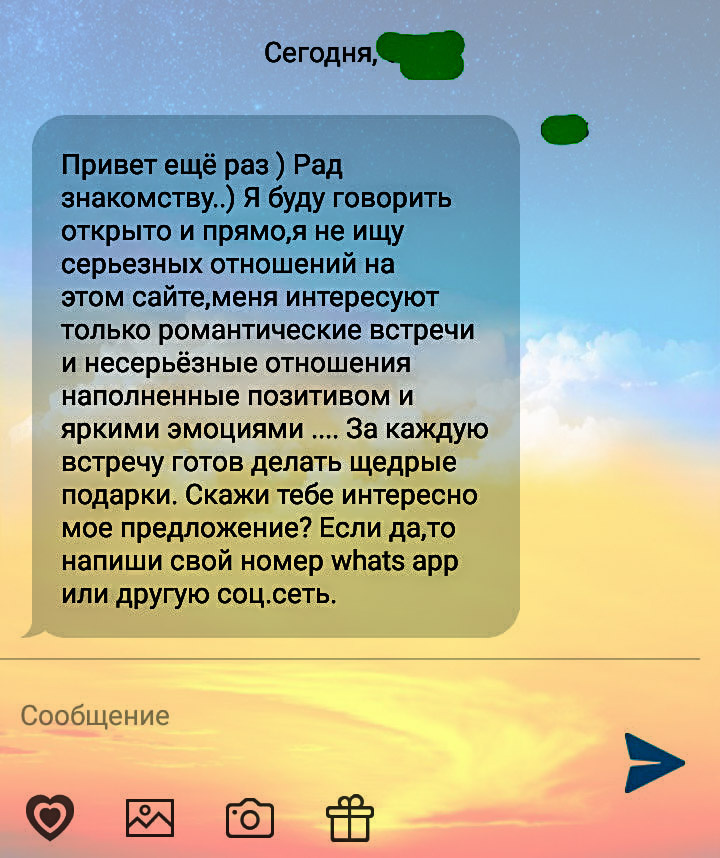 Добрый день! С недавнего времени я зарегистрирована на сайте знакомств. Ищу потихоньку мужа. А что делать. Это не шутка. Каждый день знакомлюсь с новым мужчиной, да не одним. Не со всеми хочется поддерживать переписку. Вот пример Это к теме особенностей знакомств на сайте или самих мужчин. Встречаю не первый раз. Но это сообщение захотелось показать. Почему? Судя по фотографии, автор сообщения неплохой, приятный молодой человек. Не осуждаю. Он не пытается никого обмануть, говорит честно. Печально, что испорченный, и не лучшего мнения о женщинах. Возможно даже у него есть пара. Отдельная тема, это предложение девушке интимных отношений за подарки. Это, как за еду, и такой опыт вполне реален. Не нормальное отношение к женщинам. Но виноват в этом именно женский пол, а точнее редкие его представительницы. Они, испокон веков, своим поведением, показывают мужчинам, что это позволительно. При этом содержанки за приличные деньги были и будут всегда. Не осуждаю. Они женщины, слабый пол