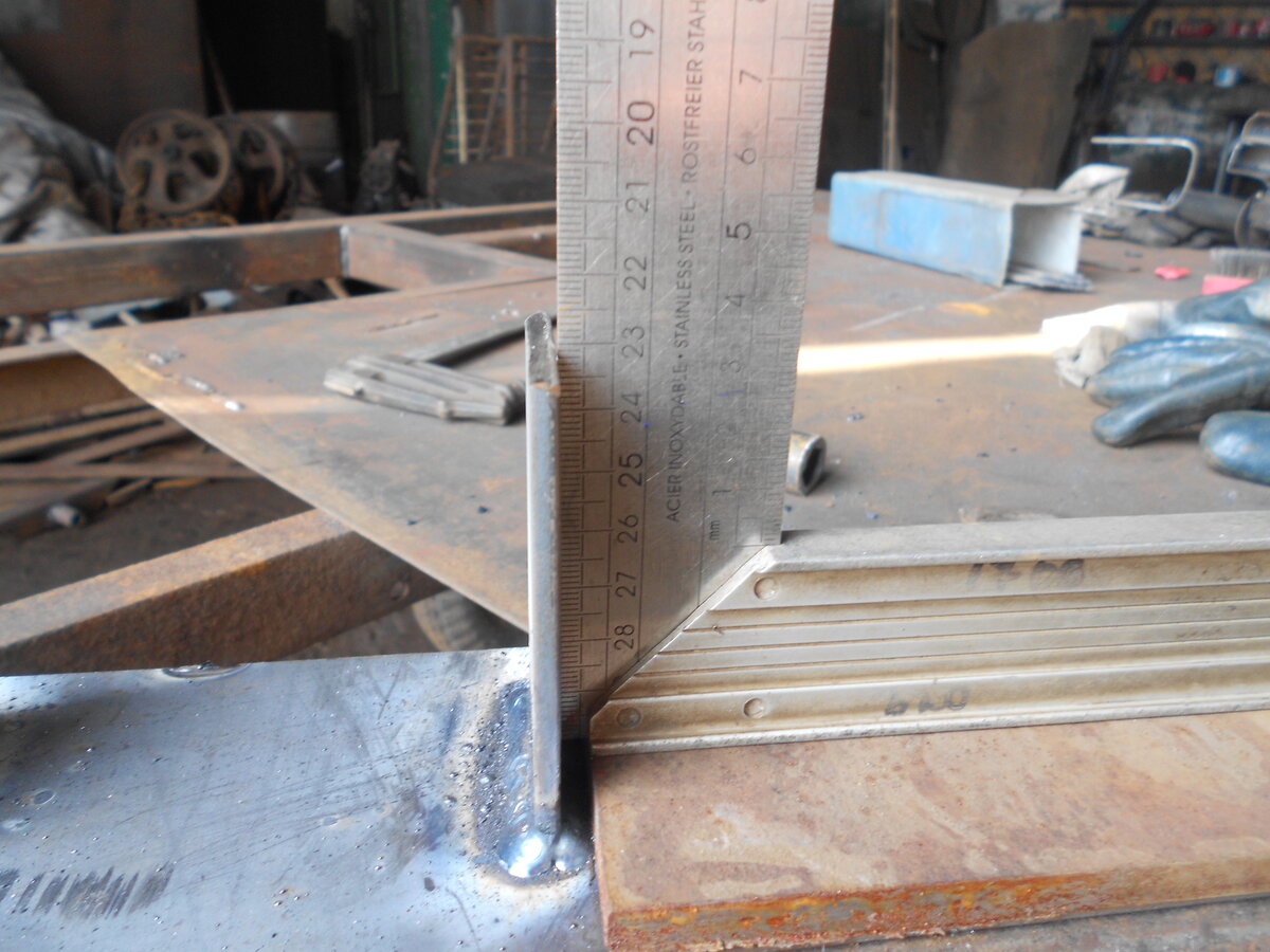 Если вдруг требуется сваривать длинные части под прямым углом, то здесь на помощь придут временные раскосины или временные косынки. Которые отрезаются после основной сварки. Я к примеру так делал когда варил кузов на камаз-стоики скрепил с платформой с помощью временных раскосин.